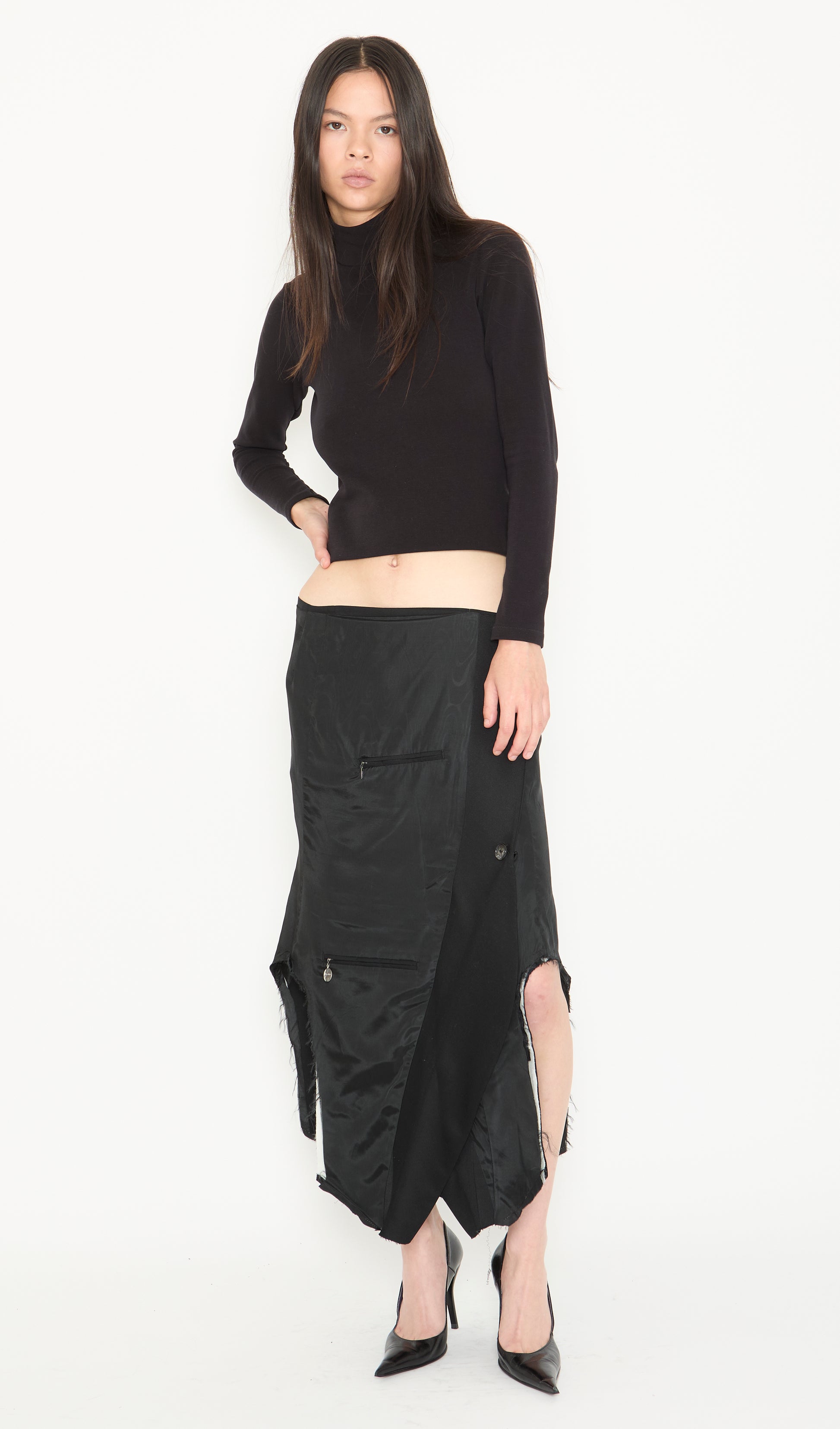 Slim-fit skirt made from an upcycled suit jacket, velcro fastening and raw edge hem. This is an upcycled product, please note that coloration and finishings may vary.